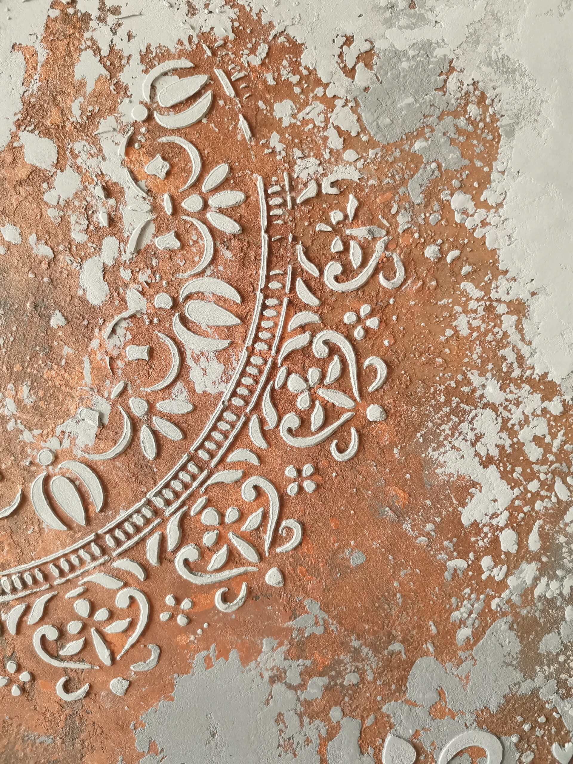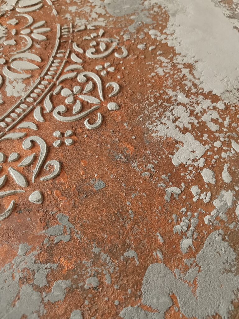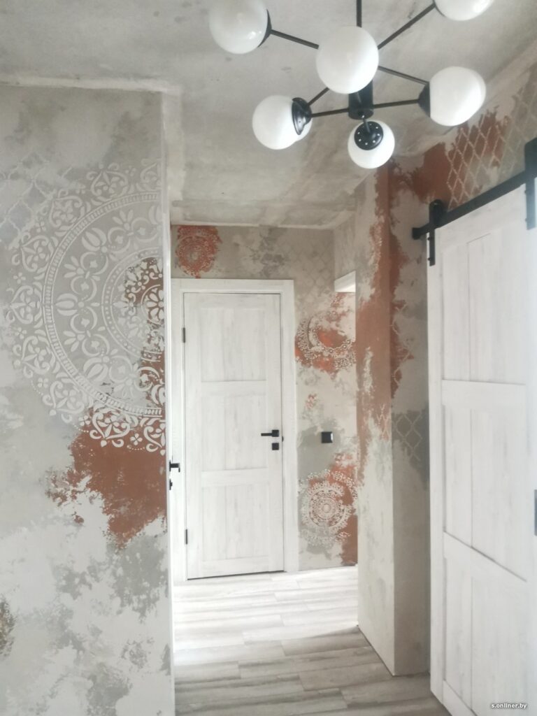 Несколько оттенков серого связали воедино напольное покрытие, потолок, двери и стены. Ржаво-медные акценты добавили выразительности. Трафареты в виде мандал разного размера помогли обыграть пятна. В коридор попадает очень мало естественного света из окон, поэтому важно было учесть пожелания заказчиков и особенности помещения.